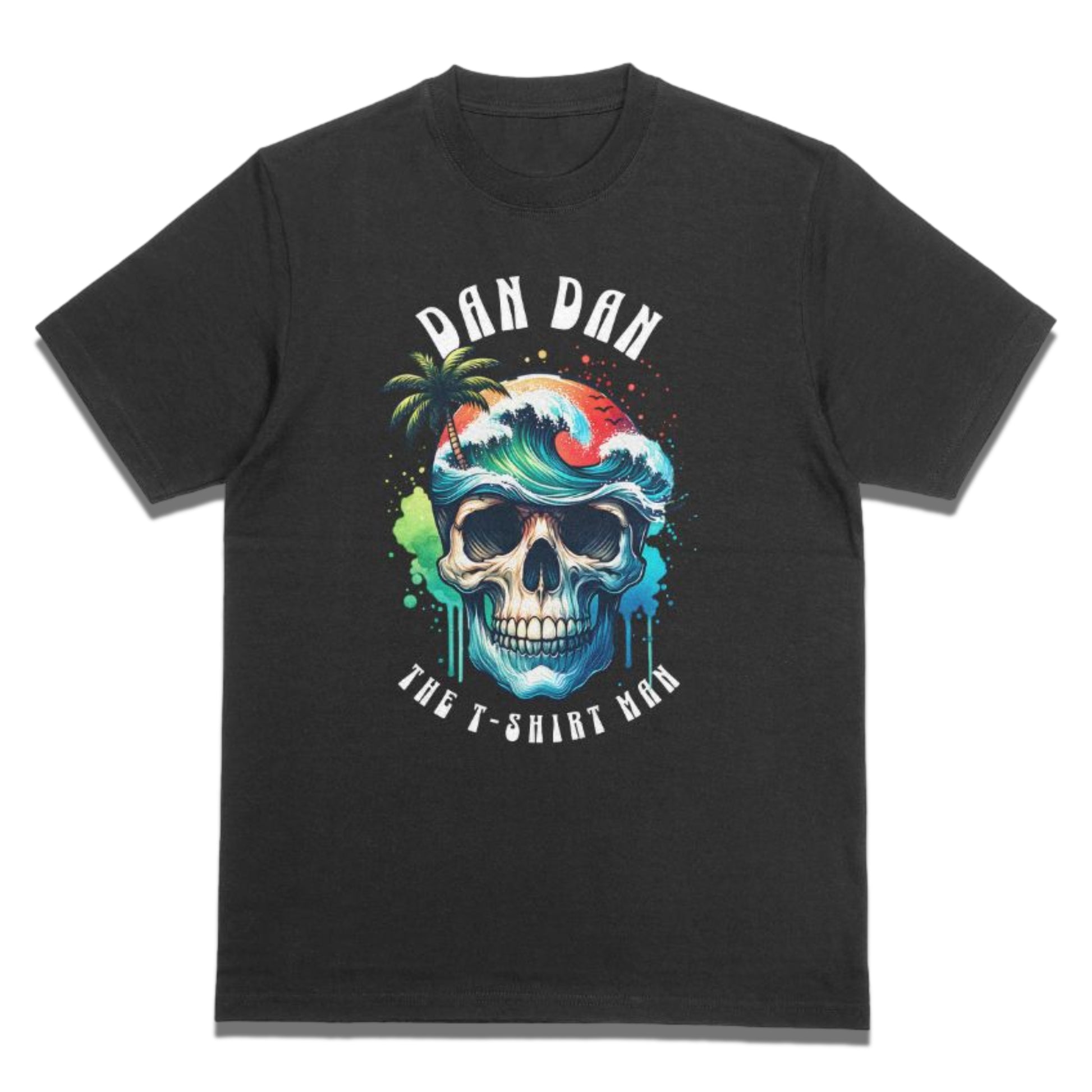 This is where it started—‘Dan Dan The T-Shirt Man’ in white, bold as a fist, stamped over a bone skull that’s got waves and a palm tree on the mind. Blue, red, green graffiti spritz and dripping paint scream street grit—no soft beach crap here, just raw roots. Black as a barroom brawl, this 5.4 oz slab of 100% American-made cotton—grown here, stitched here, inked here—stands tough.